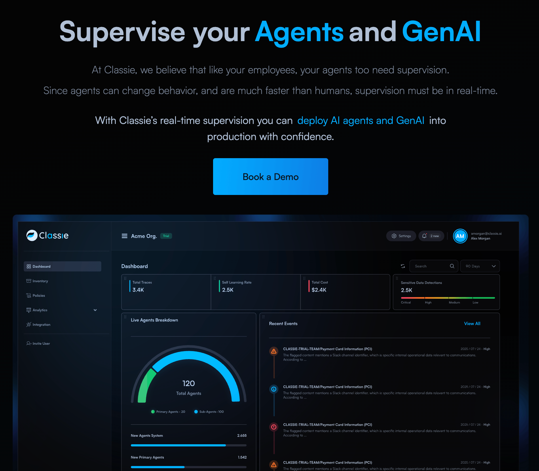Classie AI builds an enterprise platform that gives organizations complete visibility and control across every interaction that happens between users, AI agents, data, and tools. As businesses adopt faster and more autonomous agent workflows, Classie provides a clear operational layer that keeps everything governed and secure.