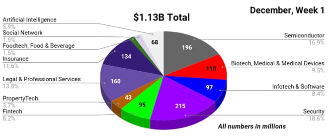 Bay Area startups closed on $1.1B in the first week of December. There were five megadeals this week, making up more than 60% of the total: Harvey, XLight Inc., Angle Health, Axiado, and Verkada. Harvey stands out as this is the third round the company has closed this year, each one at a multiple-billions increase in valuation. Their total capital now stands well above $1B.