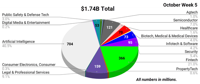 Bay Area startups closed on $1.74B in fundings this week, bringing the October total to $9.75B. Five megadeals contributed to that total, with the top two going to AI infrastructure (Mercor, $350M and Fireworks AI, $250M) and the third to fintech (SavvyMoney , $225M). Harvey raised another $150M on top of the $59M first close on their Series E earlier this month and just four months after their $300M Series D in June.